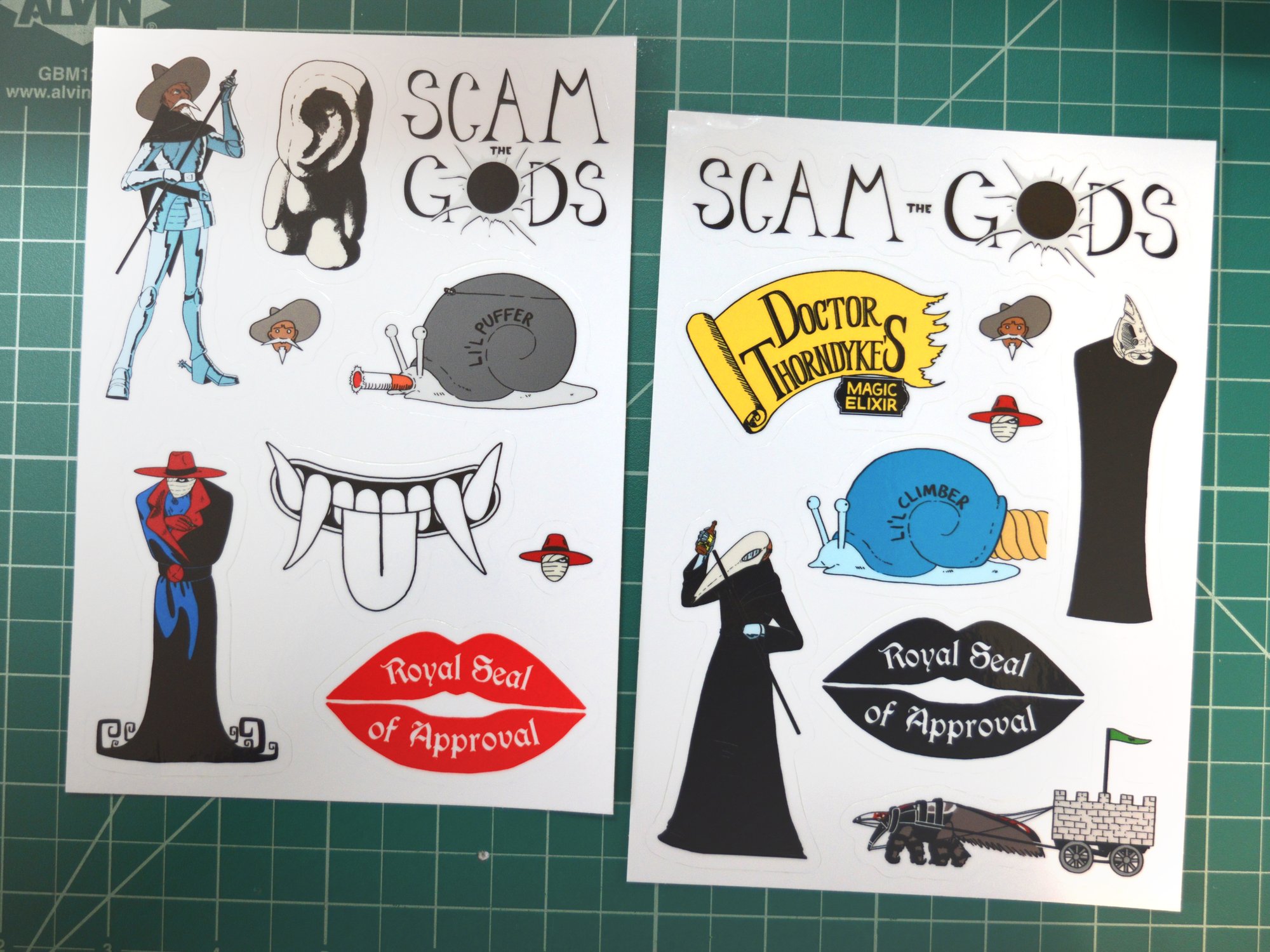 Choose from two similar-yet-different 5"x7" sheets of stickers featuring iconic imagery from Scam the Gods!